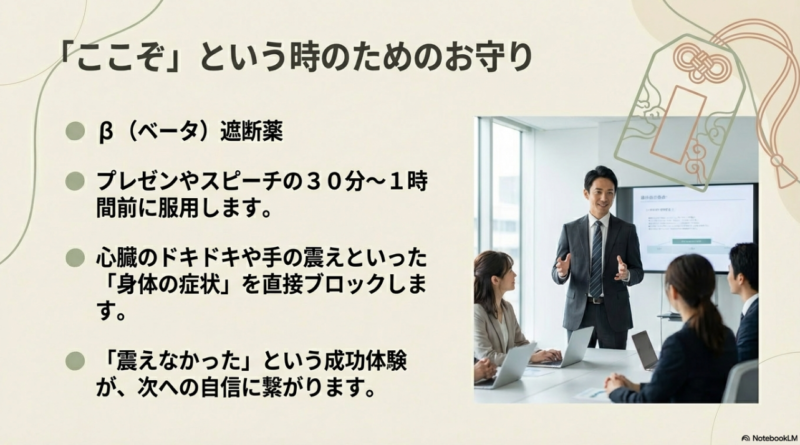 大事なのは、βブロッカーは「不安そのもの」を直接消す薬というより、身体の暴れを落ち着かせることで二次的に安心しやすくする、という位置づけだと思っています。 体が落ち着くと、「あ、意外といけるかも」という感覚が出て、予期不安が一段下がる。 これが地味に強いです。