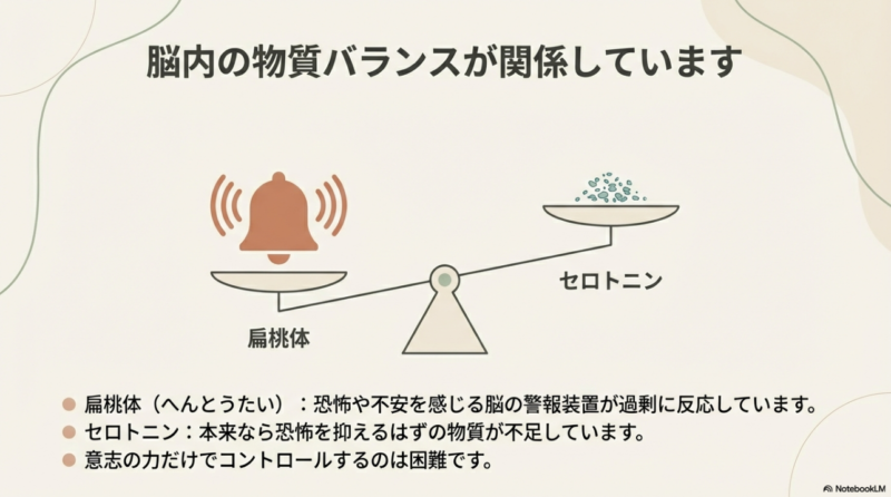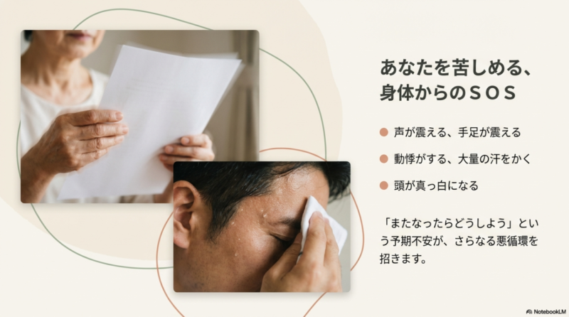 あがり症の震えは、気合いが足りないとか根性論じゃなくて、体の反応として起きます。 緊張場面で交感神経が優位になり、心拍が上がり、筋肉がこわばり、細かい振戦が出やすくなる。 そこに「震えたら終わりだ」という思考が重なると、さらに緊張が上がって…という悪循環に入ります。 つまり、震えは「不安の結果」でもあるし、「不安を増やす原因」にもなるんですよ。