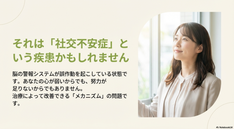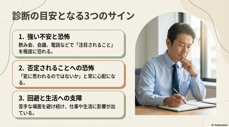 DSM-5の考え方で見ると、確認されるのは大きく3つです。 どんな場面で不安が出るか(スピーチ、会議、雑談、会食、電話など)、何が怖いか(恥をかく、変に思われる、否定される、声や手が震えるのを見られる等)、そして回避の有無(避けているか、強い恐怖を抱えながら耐えているか)。 ここ、気になりますよね。 「耐えてるから大丈夫」じゃなくて、耐えてる時点でかなり消耗していることが多いです。