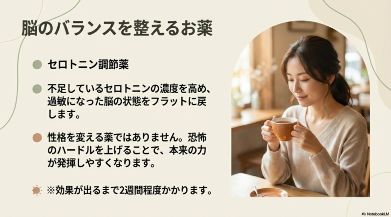 ここ、誤解が起きやすいポイントです。 SSRIは「不安を完全に消す魔法」ではなく、不安が暴走しにくい土台を作る方向です。 土台が整うと、同じ場面に立っても「心臓が爆発しそう」から「緊張はするけど対処できる」に変わっていきやすい。 すると、回避が少しずつ減って、経験が積めて、さらにラクになる…という好循環が回りやすいです。