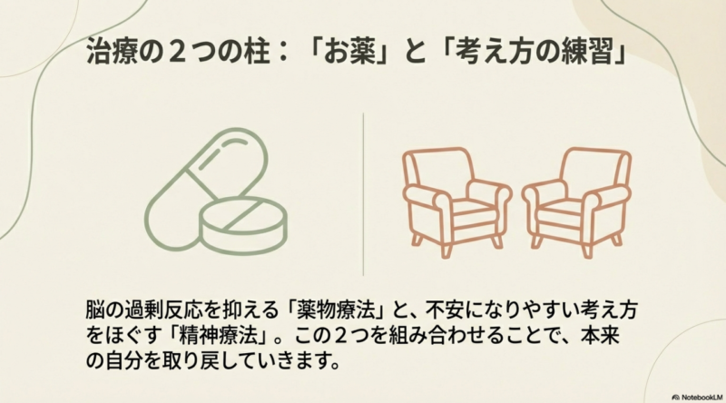 治療は「当日の不安をどうするか」と「生活の幅をどう戻すか」の二本立てで考えるとスッキリします。 薬物療法と心理療法は対立ではなく、うまく組み合わせると進みが早いです。