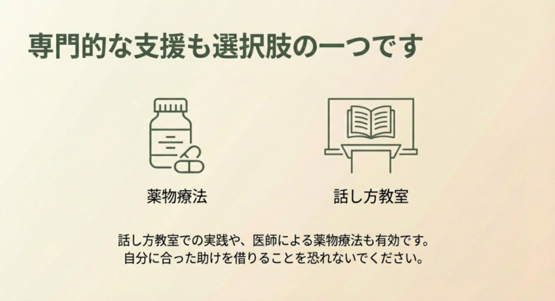 それでもつらい、回避が増えて生活に支障があるなら、心療内科など医療の力や、話し方教室のサポートも選択肢です。  正確な情報は公式サイトをご確認ください。  そして、必要なら最終的な判断は専門家にご相談ください。  あなたに合うやり方で、少しずつ積み上げていきましょう。