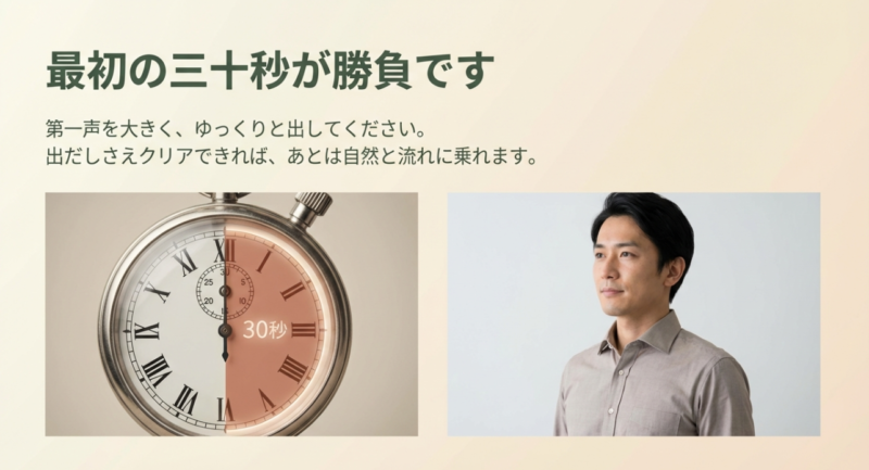 本番で一番震えやすいのは“最初の一言”。  だから事前に、短い挨拶を少し大きめに出す練習をして「声の軌道」を作ります。  喉で頑張らず、お腹で支えるイメージです。