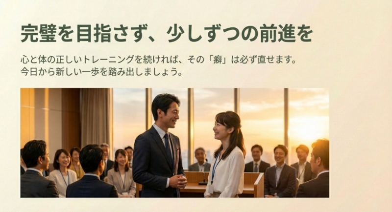 今日からやるなら、まずはシンプルに2つです。  吐く息を長くする呼吸法と、震えを一瞬リセットする動作。  これが“その場で使える武器”になります。  次に、認知行動療法的に“失敗の定義”を変える。  ゴールを「完璧」じゃなく「伝える」に置く。  これでかなりラクになります。