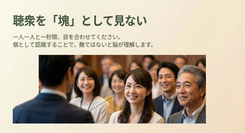 私がよくやるのは、冒頭30秒だけを“儀式化”すること。  歩き方、立ち位置、目線、第一声、間、呼吸。  ここが決まると、残りは流れでいけます。  逆に冒頭がグラつくと、その後ずっと修正に追われます。
