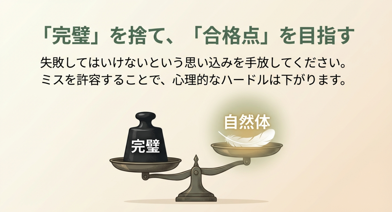 失敗ゼロを目標にすると、緊張は増えます。  だから私は、成功の定義を「相手に要点が伝わった」に置くのが好きです。  多少噛んでも、目的が達成できたらそれは成功。