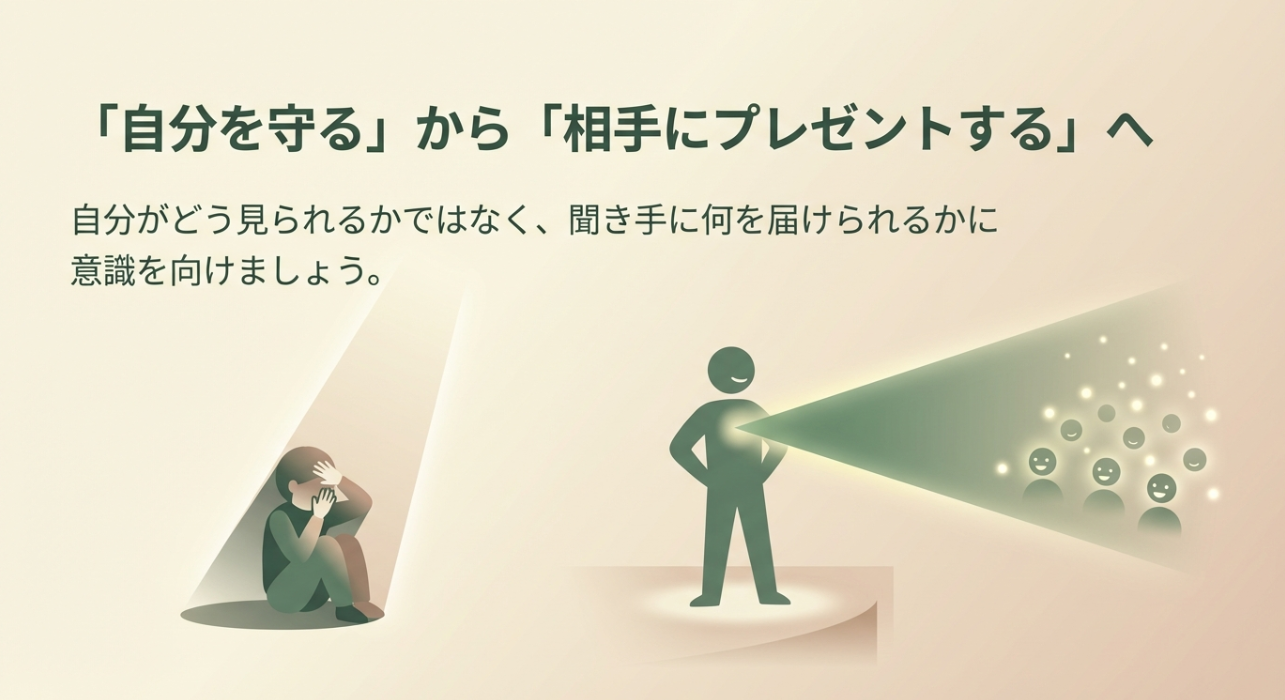 さらに言うと、「震えない」「赤くならない」をゴールにすると、身体反応に意識が固定されて緊張が増えます。  だからゴールを“外側”に置く。  「相手が理解できた」「結論が残った」「次の行動が決まった」。  この方向に置くと、自意識が減っていきます。