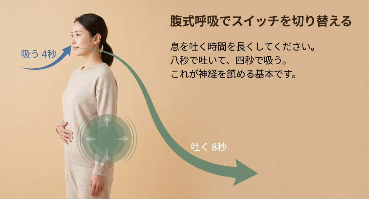 吸うより吐くを意識して、ゆっくり吐き切る。  これだけでも副交感神経に寄せやすいです。  腹式呼吸は「お腹をふくらませる」より、息を下腹に落とすイメージで吐き切るほうが感覚を掴みやすいと思います。