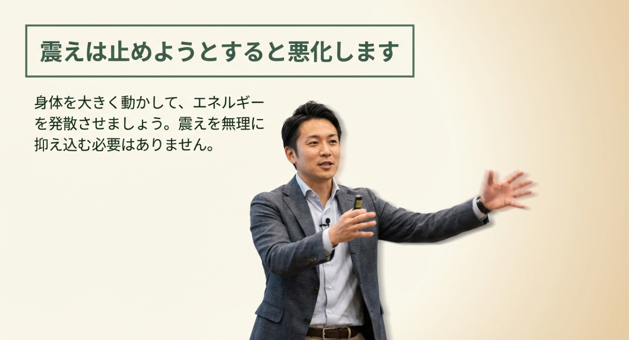 なので私は、震えが出そうな瞬間に“あえて大きく動かす”をおすすめします。  これ、やる前は変に感じるかもですが、理屈としてはシンプルで、細かい震え(無意識の収縮)に対して、意識的な大きい運動指令を入れて「主導権」を取り戻すんです。
