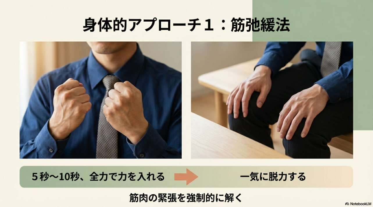 やり方はシンプルで、両手を強く握る→肩をすくめる→腕に力を入れて5秒キープ→一気に脱力。 このとき、「抜けた感覚」を10秒くらい味わうのがコツです。 脱力って、意識だけだと難しいんですよね。 だから一度“最大緊張”を作ってから落とすと、体が勝手に弛緩を覚えやすいです。