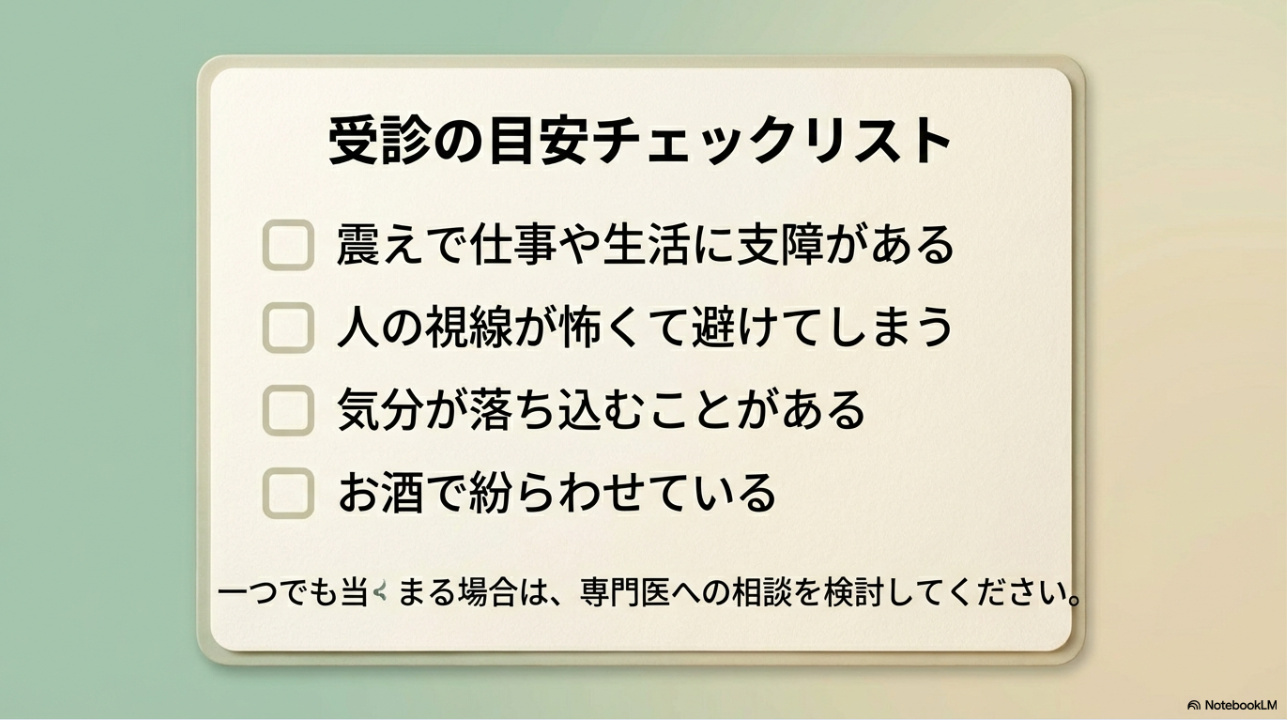 ただし、症状が強い場合や、震えが日常でも続く場合は、自己判断で抱え込まずに医療機関へ。 正確な情報は公式サイトをご確認ください。 最終的な判断は専門家にご相談ください。