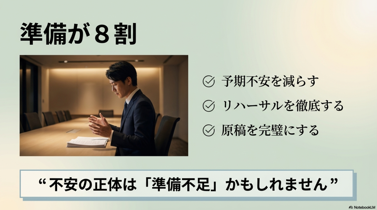 予期不安って、簡単に言うと「本番より前に、脳内で負け試合を始めちゃう状態」です。 たとえば前日から「手が震えたらどうしよう」「声が震えたら終わる」「変な目で見られる」みたいな映像が頭に浮かぶ。 これ、ただの想像なのに、体は“現実の危険”として反応しやすいんです。 だから緊張は当日に突然起きるんじゃなくて、数時間〜数日かけてじわじわ蓄積していくこともあります。