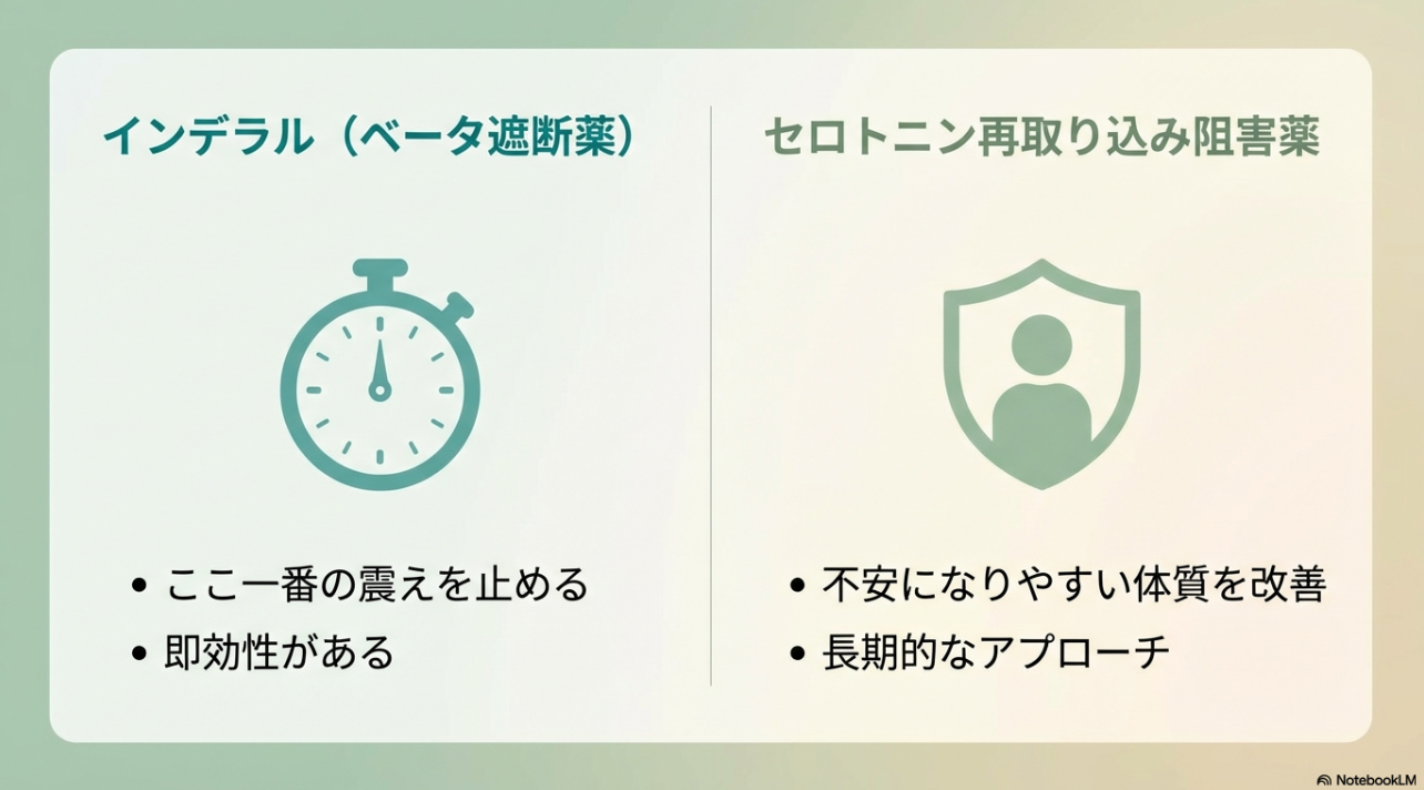 薬の考え方は、ざっくり「今を乗り切る」か「土台を整える」かで分けると整理しやすいです。 あがり症の手足の震えで悩む人は「とにかく本番だけどうにかしたい」フェーズと、「そもそも日常がしんどい」フェーズが混ざりやすいので、同じ薬が正解とは限りません。