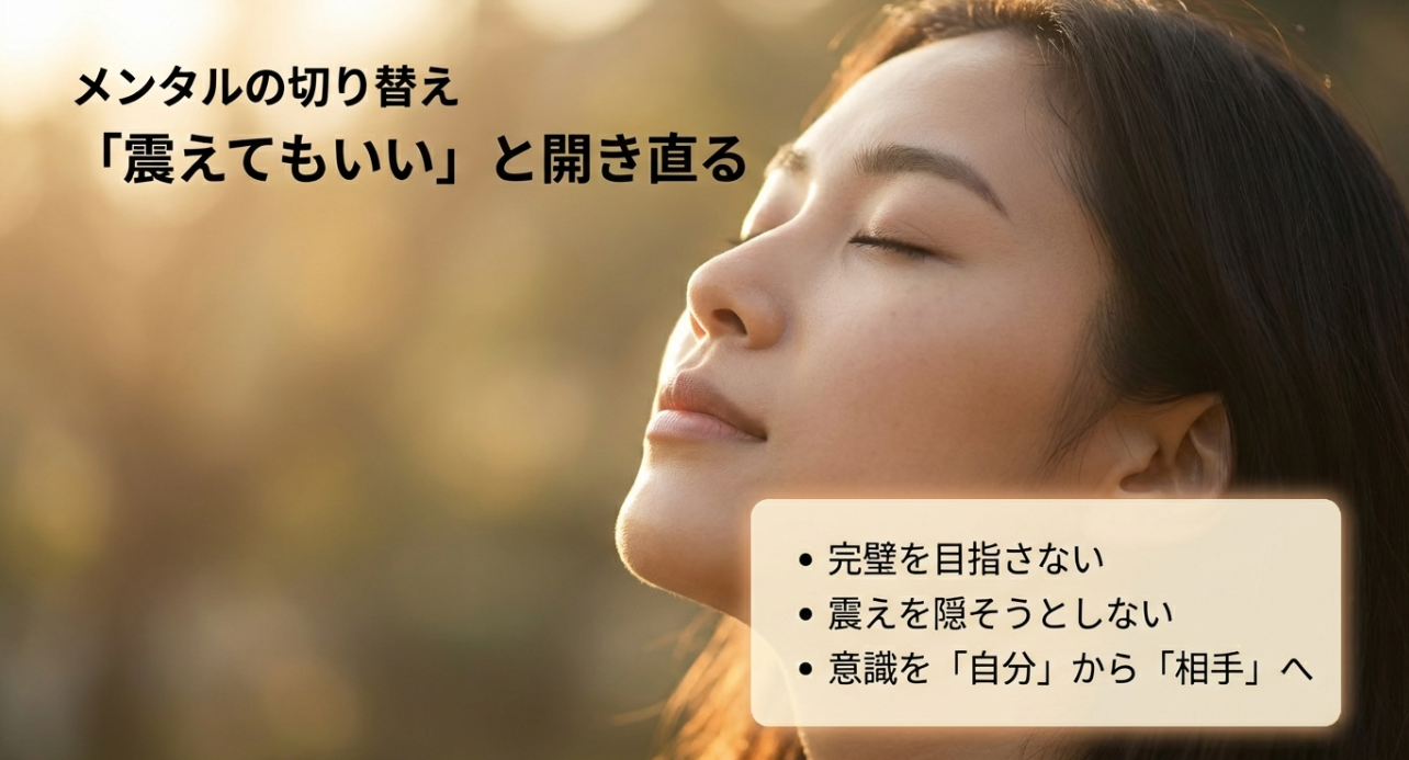 本番直前の対処は、精神論より体側から落とすのがコツです。 私は基本、次の3つをセットで考えます。 ここでのゴールは「完璧に緊張しない」じゃなくて、震えが出てもパフォーマンスが崩れない状態に持っていくことです。